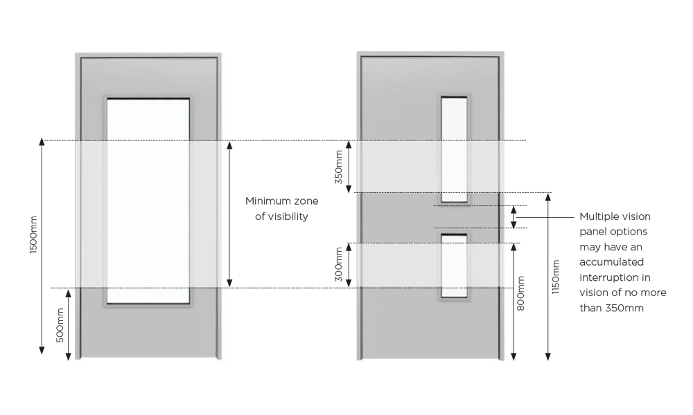High-quality, durable doorsets available with vision panels and side screens to promote the transition of natural light into internal spaces. Many fire doors within education, healthcare and commercial sectors will include at least one vision panel per door leaf. The position of each vision panel must fall within the guidelines highlighted below to ensure of inclusivity where all types of users can benefit from the vision panel.